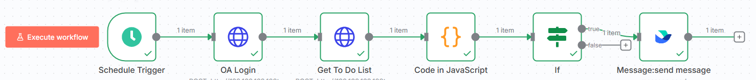 今天花了半天时间实现了一个读取公司的待办列表,如果有新的待办任务就自动发送到自己的飞书账号的工作流,这样上班的时候就不用老查看老板有没有发新的任务过来了。由于里面涉及到一些不便透露的技术细节,所以就不在这里一步步讲解了,只贴出我最后的工作流图,大概思路是每30分钟登录一下系统,读取待办任务,如果有新的待办就发送到飞书即可。注意n8n最好通过node安装在自己的电脑上,这样就不用担心安全问题了。想了解更多的可以邮件和我联系76589755@qq.com。有事快办,没事摸鱼!